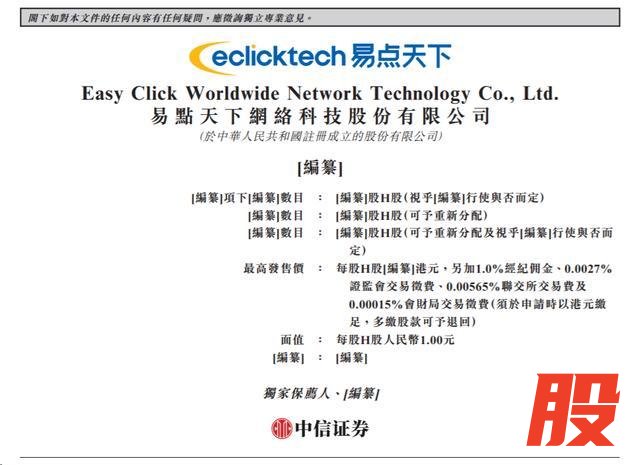 瑞财经王敏3月26日,据港交所披露,易点天下网络科技股份有限公司(以下简称“易点天下”)向港交所主板递交上市申请书,中信证券为其独家保荐人。