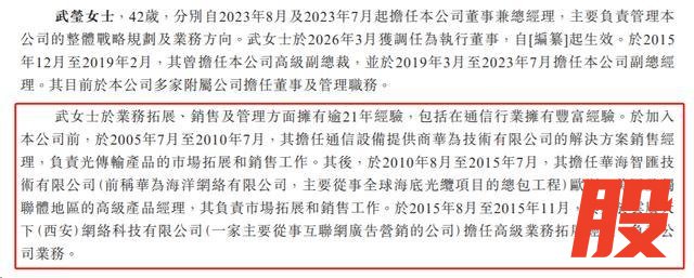 武莹于业务拓展、销售及管理方面拥有逾21年经验,包括在通信行业拥有丰富经验。于加入公司前,于2005年7月至2010年7月,其担任通信设备提供商华为技术有限公司的解决方案销售经理,负责光传输产品的市场拓展和销售工作。其后,于2010年8月至2015年7月,其担任华海智汇技术有限公司(前称华为海洋网络有限公司)欧洲、美国及独联体地区的高级产品经理,其负责市场拓展和销售工作。于2015年8月至2015年11月,其亦于云广天下(西安)网络科技有限公司担任高级业务拓展经理,负责公司业务。